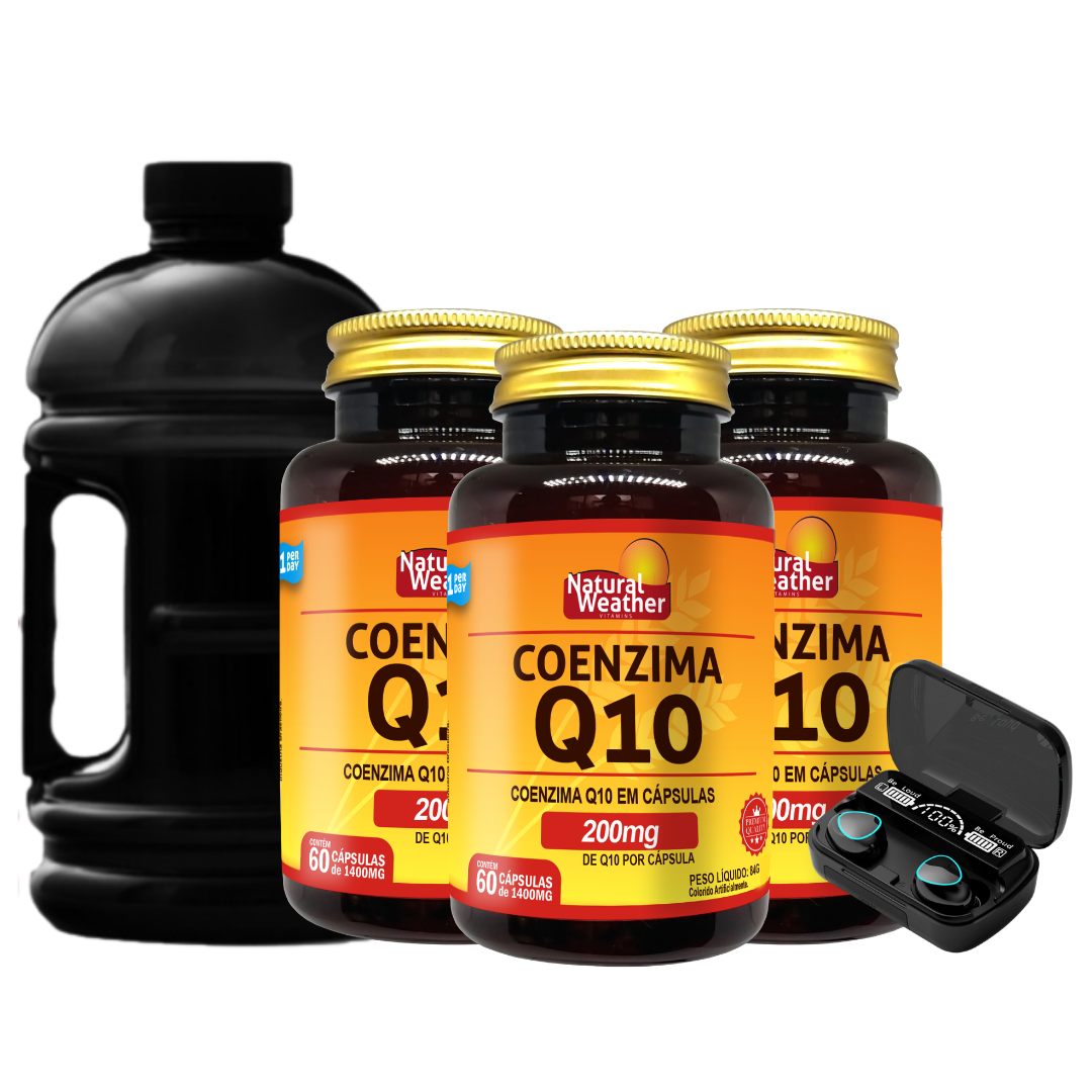 Na compra do Kit com 3 unidades de Coenzima Q10 Natural Weather, você garante preço especial e recebe gratuitamente um fone de ouvido e um galão de água de 2,2 litros. Mais economia, praticidade e benefícios em um único pedido.